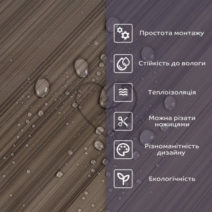 • 2. Стійкість до вологи: матеріал стійкий до впливу вологи та пари, а також до появи плісняви, що робить його придатним для використання у приміщеннях з високою вологістю, таких як ванни та кухні. Плитка підходить для створення фартуха кухні, можна клеїти біля плити на відстані не менше ніж 20-25 см;