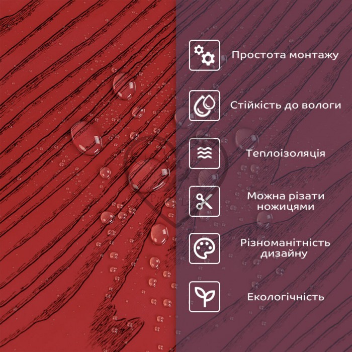 • 1. Легкість та міцність: плитка легка та міцна, що спрощує її логістику, установку та забезпечує довгий термін служби. Матеріал легкий в установці, можна різати ножицями чи монтажним ножем, не потребує додаткових матеріалів чи спеціалістів. Між смугами не розходиться, не роздмухується і не деформується. Відсоток обрізу становить 1%, що є найкращим показником для настінних покриттів;