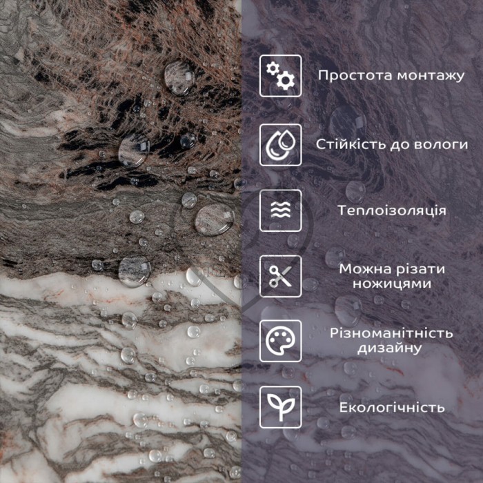 - 1. Легкість та міцність: плитка легка та міцна, що спрощує її логістику, установку та забезпечує довгий термін служби. Матеріал легкий в установці, можна різати ножицями чи монтажним ножем, не потребує додаткових матеріалів чи спеціалістів. Між смугами не розходиться, не роздмухується і не деформується. Відсоток обрізу становить 1%, що є найкращим показником для настінних покриттів;