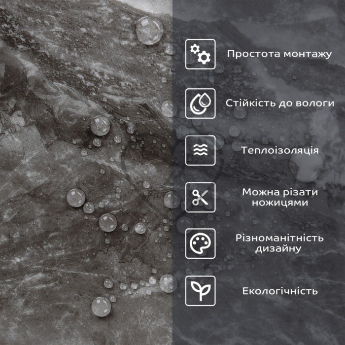 • 2. Стійкість до вологи: матеріал стійкий до впливу вологи та пари, а також до появи плісняви, що робить його придатним для використання у приміщеннях з високою вологістю, таких як ванни та кухні. Плитка підходить для створення фартуха кухні, можна клеїти біля плити на відстані не менше ніж 20-25 см;